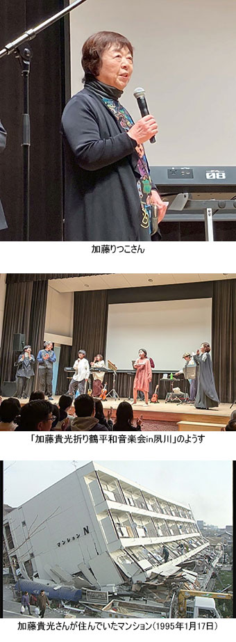 12月20日、「加藤貴光折り鶴平和音楽会in夙川」では、貴光さんがりつこさんに書いた手紙をもとにした楽曲「親愛なる母上様」を、熊本・阿蘇の音楽デュオ「Viento」とクロマチックハーモニカの岡直弥さんが演奏。りつこさんは、「ずっと夙川に来るのが辛かったが、みなさんのあたたかさに触れて、きょうから変われそうだ」と語りました。音楽会開催のいきさつと当日の模様を、番組プロデューサーがリポートします。