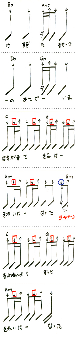 ジャーンと弾くところと、短く軽くジャカと弾くところの差を書いてみました。