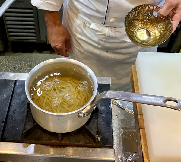 マカロニの弾力を楽しむため、すこし硬めに湯がくのがポイント。